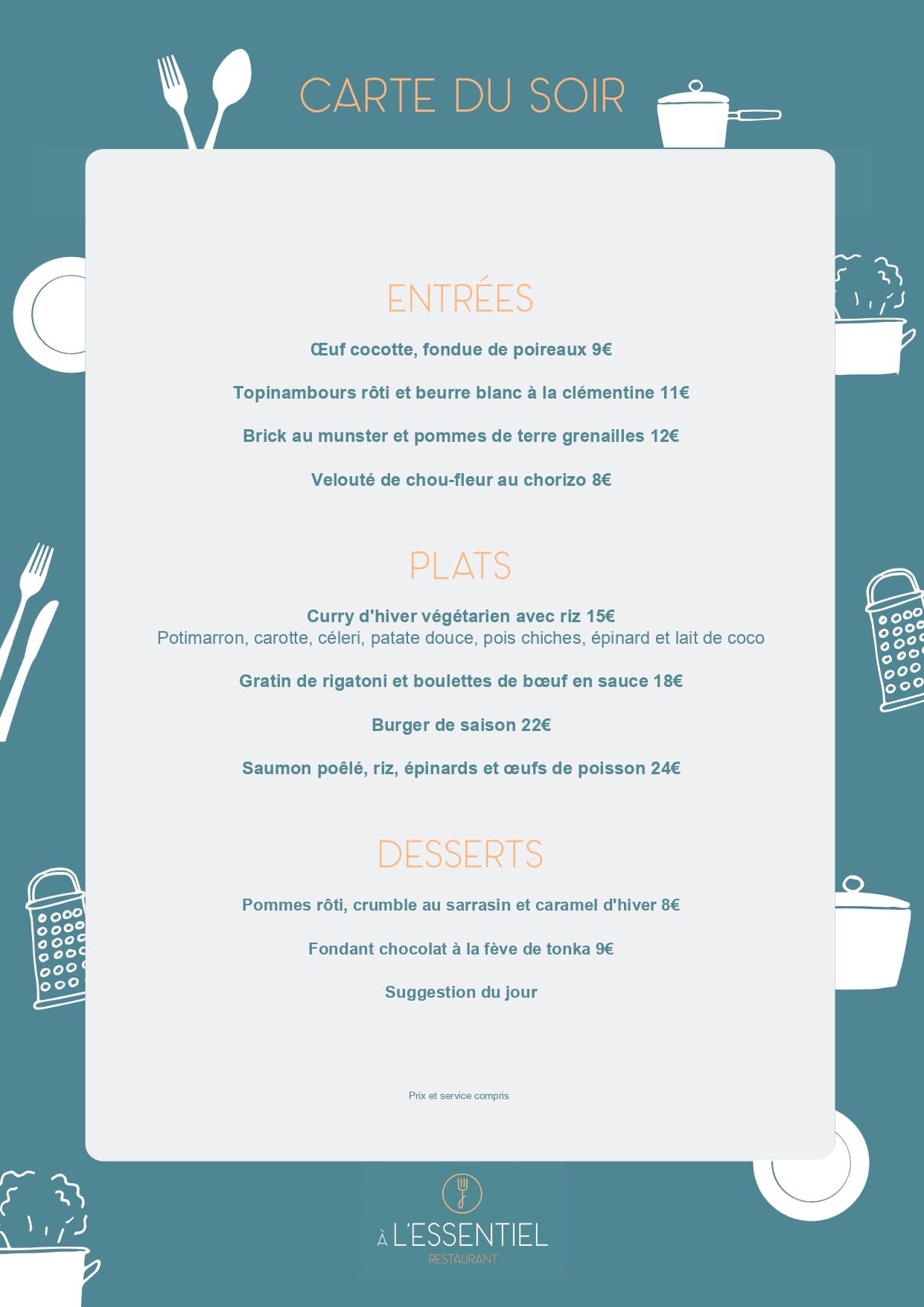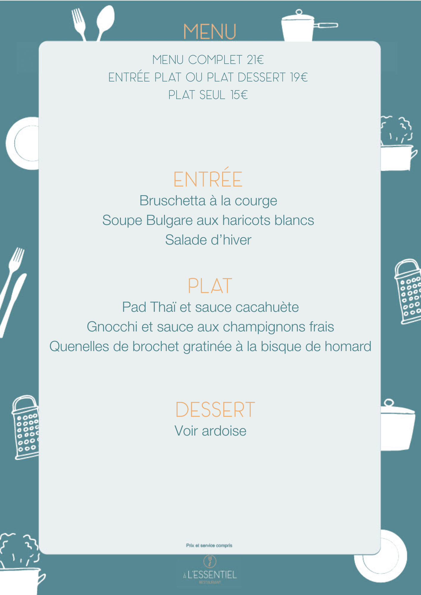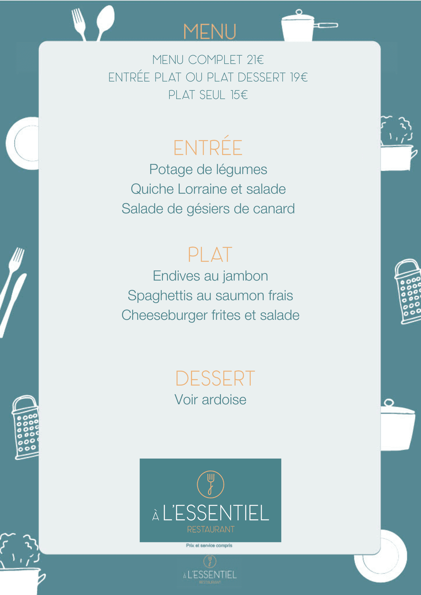 Retrouvez les différentes cartes du Restaurant À L’Essentiel en cliquant sur les boutons ci-dessous.